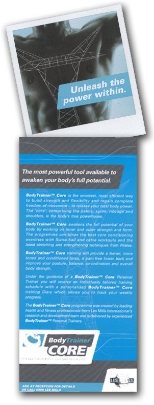 BodyTrainer™ CoreThe most powerful tool available to awaken your body's full potential. Body Trainer™ Core is the smartest, most efficient way to build strength and flexibility and regain complete freedom of movement - to release your total body power. The 'core' comprising the pelvis, spine, ribcage and shoulders, is the body's true powerhouse. BodyTrainer™ Core awakens the full potential of your body by working on inner and outer strength and form. The programme combines the best core conditioning exercises with Swiss ball and cable workouts and the latest stretching and strengthening techniques from Pilates. BodyTrainer™ Core training will provide a leaner, more toned and conditioned torso, a pain-free lower back and improve your posture, balance, co-ordination and overall body strength. Under the guidance of a BodyTrainer™ Core Personal Trainer you will receive an individually tailored training schedule with a personalised BodyTrainer™ Core training Diary which allows you to track your weekly progress. The BodyTrainer™ Core program was created by leading health and fitness professionals from Les Mills international's research and development team and is delivered by experienced BodyTrainer™ Core Personal Trainers.